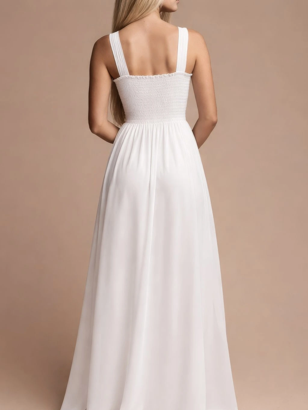 Zadní část je řešena pružným řasením (žabičkováním), díky kterému se šaty přizpůsobí postavě a dobře sedí v oblasti zad i pasu. Tento detail zároveň usnadňuje oblékání.