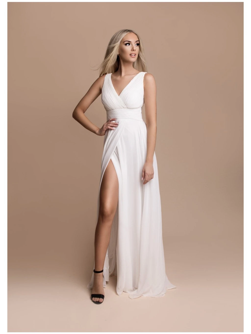 Dlouhá splývavá sukně je doplněna vysokým rozparkem, který šatům dodává lehkost a umožňuje pohodlný pohyb při chůzi i tanci.
