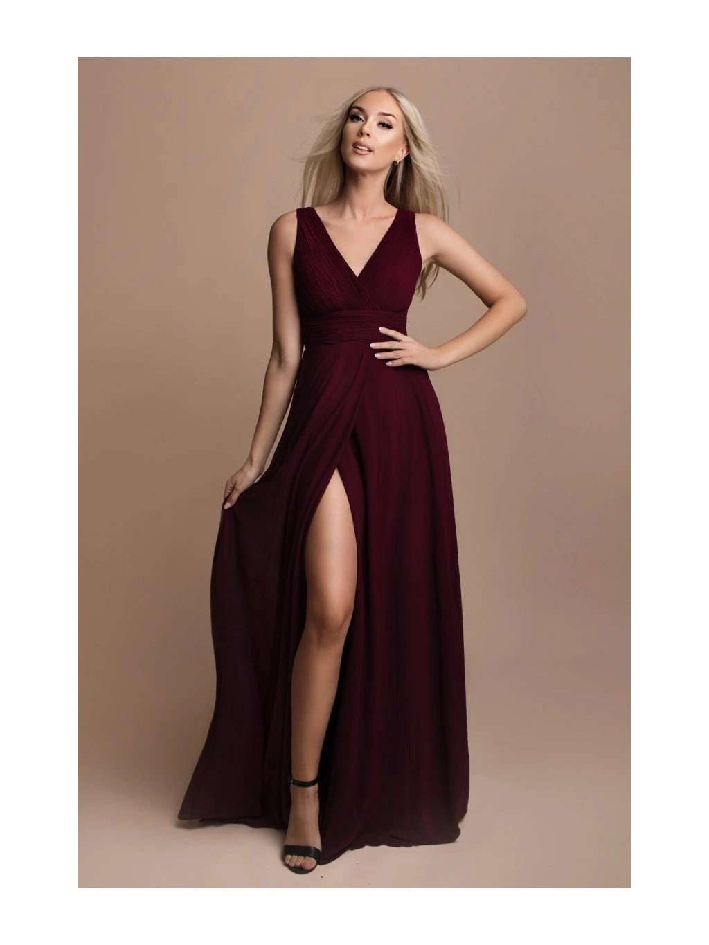 Dlouhá splývavá sukně je doplněna vysokým rozparkem, který šatům dodává lehkost a umožňuje pohodlný pohyb při chůzi i tanci.