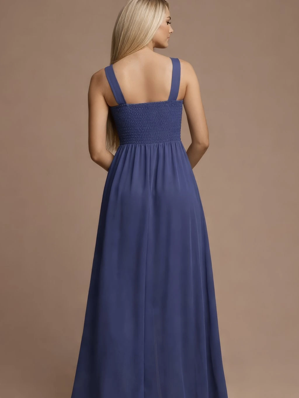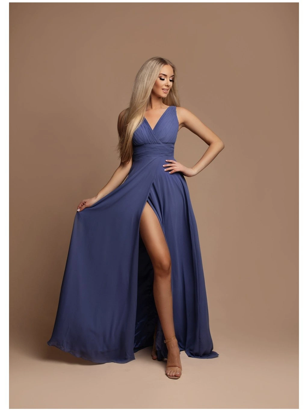 Dlouhé společenské šaty v tlumeném modrém odstínu jsou skvělou volbou na svatby, plesy i další slavnostní události. Díky lehkému materiálu působí vzdušně a při pohybu krásně splývají. Střih zvýrazňuje pas a vytváří přirozeně ženskou siluetu.