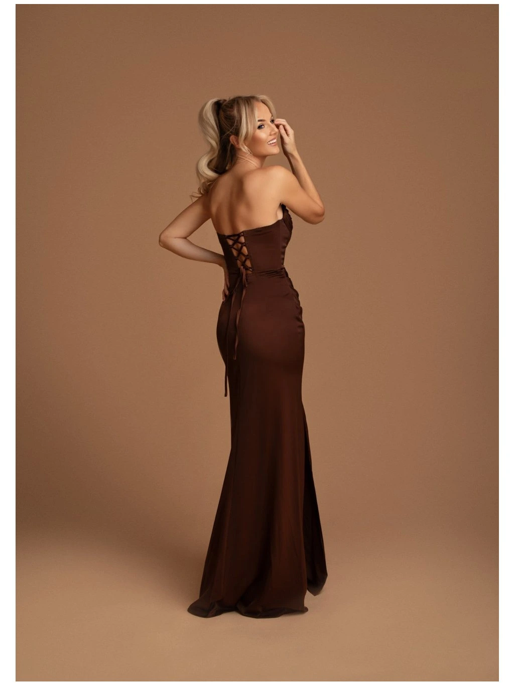 Přední část šatů doplňuje výrazný rozparek, který šatům přidává lehkost a umožňuje pohodlný pohyb při chůzi nebo tanci. Zadní část je řešená šněrováním, díky kterému si můžete šaty snadno přizpůsobit podle postavy a zároveň vytváří velmi hezký detail na zádech.