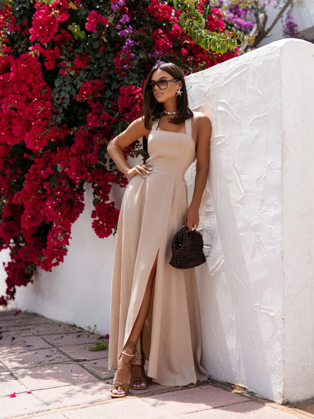 Vzdušné, jemné a naprosto okouzlující. Tyto dlouhé letní šaty z viskózy jsou jako stvořené pro dny plné slunce. Zavazování za krkem krásně zvýrazní ramena a dekolt, boční kapsy přidávají na praktičnosti a rozparek ve spodní části dodává šatům svůdný pohyb.