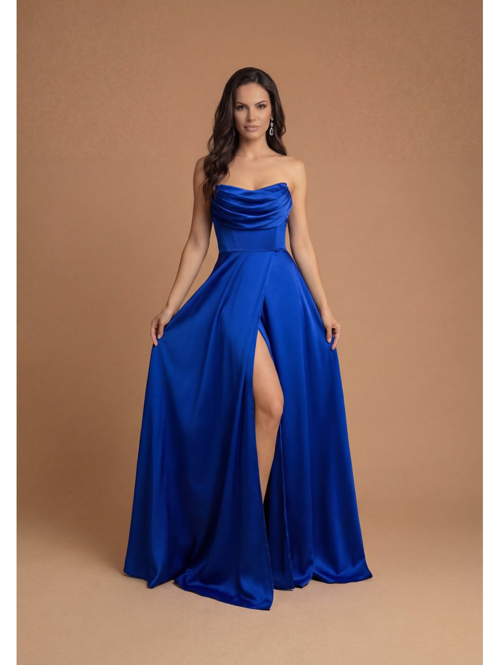 Saténové šaty TEA zaujmou na první pohled svým ženským střihem a dlouhou splývavou sukní s rozparkem. Vystužený korzet na šněrování a jemně tvarovaný živůtek s řasením krásně zvýrazňuje dekolt.