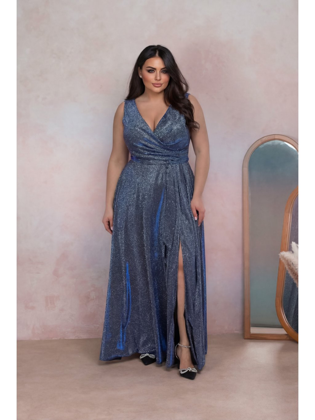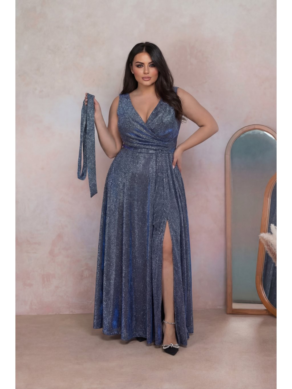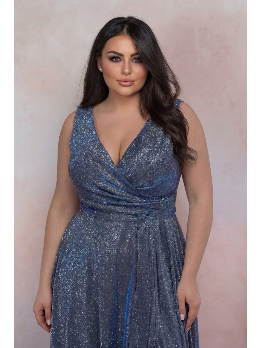 Společenské šaty AMANDA LUX jsou ze splývavého, třpytivého materiálu, který při pohybu odráží odlesky stříbrné a modré barvy. Výstřih do V opticky prodlužuje siluetu a dodává šatům elegantní a žensky působící vzhled. Jemný rozparek na boku přidává šmrnc a atraktivní nádech. Pásek v pase je odnímatelný.